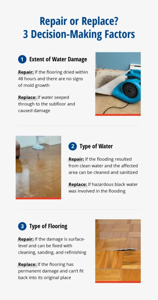 Next, clean the affected area thoroughly using a mixture of water and detergent or a commercial mold cleaner. Ensure the area is completely dry before reinstalling new flooring to prevent future mold growth.